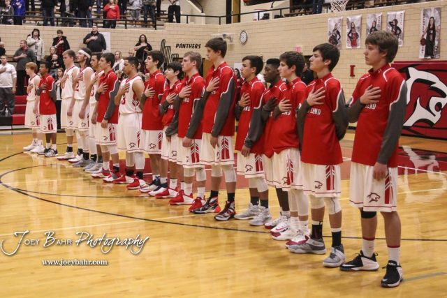 The Great Bend Panthers line up for the National Anthem. The Hays Indians defeated the Great Bend Panthers by a score of 51 to 37 at Great Bend High School in Great Bend, Kansas on January 10, 2017. (Photo: Joey Bahr, www.joeybahr.com)undefined