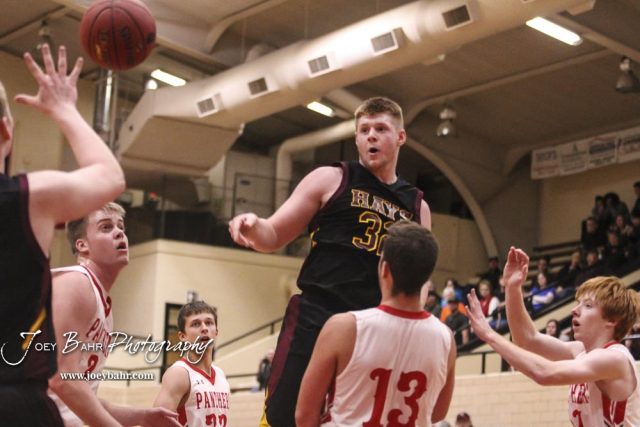 Hays Indian #32 Shane Berens dishes the ball to a teammate. The Hays Indians defeated the Great Bend Panthers by a score of 51 to 37 at Great Bend High School in Great Bend, Kansas on January 10, 2017. (Photo: Joey Bahr, www.joeybahr.com)undefined