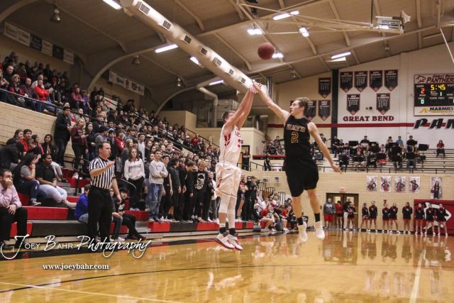 Hays Indian #2 Cole Murphy tries to block a shot by Great Bend Panther #3 Kody Crosby. The Hays Indians defeated the Great Bend Panthers by a score of 51 to 37 at Great Bend High School in Great Bend, Kansas on January 10, 2017. (Photo: Joey Bahr, www.joeybahr.com)undefined