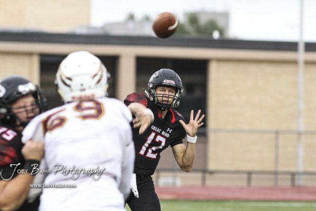 Great Bend Panther #12 Koy Brack throws a pass in the first quarter. The Hays Indians faced off with the Great Bend Panthers at Memorial Stadium in Great Bend, Kansas on September 7, 2018. (Photo: Joey Bahr, www.joeybahr.com)undefined