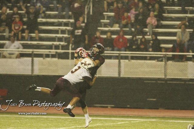 Great Bend Panther #2 Alex Schremmer pulls in a pass in the fourth quarter as Hays Indian #3 Taivian Creamer defends. The Great Bend Panthers defeated the Hays Indians with a score of 15 to 7 at Memorial Stadium in Great Bend, Kansas on September 7, 2018. (Photo: Joey Bahr, www.joeybahr.com)undefined