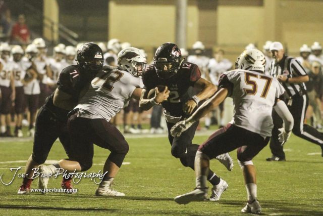 Great Bend Panther #12 Koy Brack carries the ball as #71 Kaden Schroeder blocks down on Hays Indian #72 Matthew Younker in the fourth quarter. The Great Bend Panthers defeated the Hays Indians with a score of 15 to 7 at Memorial Stadium in Great Bend, Kansas on September 7, 2018. (Photo: Joey Bahr, www.joeybahr.com)undefined