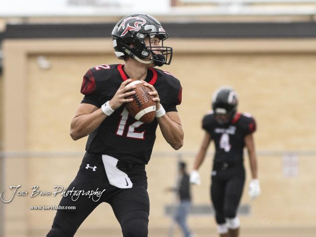 Great Bend Panther #12 Koy Brack winds up to throw a pass during warmups. The Hays Indians faced off with the Great Bend Panthers at Memorial Stadium in Great Bend, Kansas on September 7, 2018. (Photo: Joey Bahr, www.joeybahr.com)undefined
