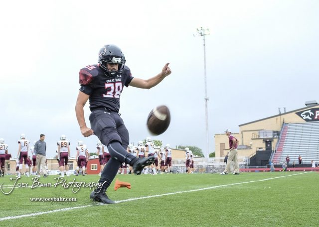 Great Bend Panther #38 Dani Franco kicks off a ball during warmups prior to the start of the game. The Great Bend Panthers defeated the Hays Indians with a score of 15 to 7 at Memorial Stadium in Great Bend, Kansas on September 7, 2018. (Photo: Joey Bahr, www.joeybahr.com)undefined