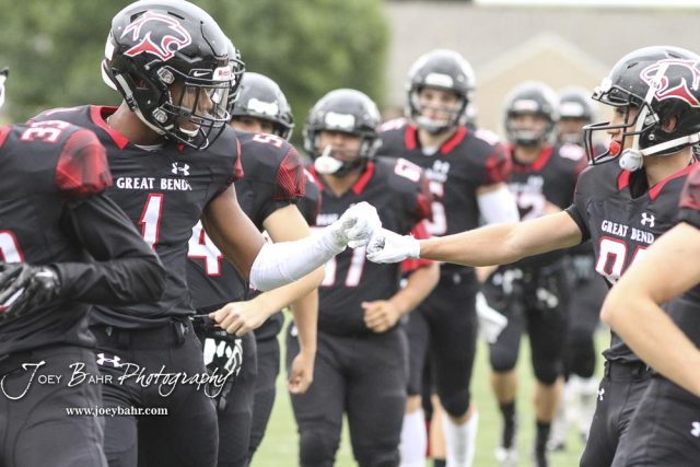 Great Bend Panther #1 Bryce Brown and #81 Sam Ryan bump fists during warmups. The Hays Indians faced off with the Great Bend Panthers at Memorial Stadium in Great Bend, Kansas on September 7, 2018. (Photo: Joey Bahr, www.joeybahr.com)undefined