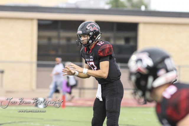 Great Bend Panther #12 Koy Brack waits for the ball to be snapped to him in the in the first quarter. The Hays Indians faced off with the Great Bend Panthers at Memorial Stadium in Great Bend, Kansas on September 7, 2018. (Photo: Joey Bahr, www.joeybahr.com)undefined