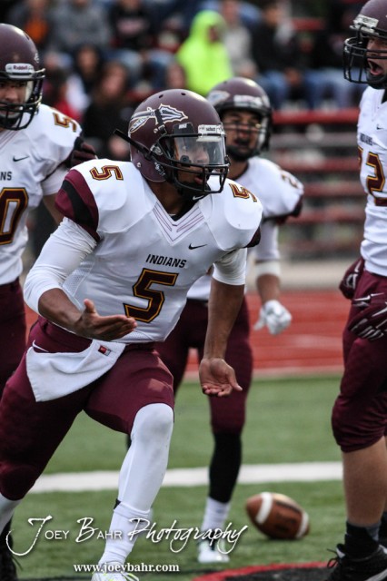 Hays Indian Alex Delton (#5) celebrates scoring a touchdown during the Hays Indians versus Great Bend Panthers High School Football game with Hays winning 49 to 6 at Memorial Stadium in Great Bend, Kansas on September 12, 2014. (Photo: Joey Bahr, www.joeybahr.com)