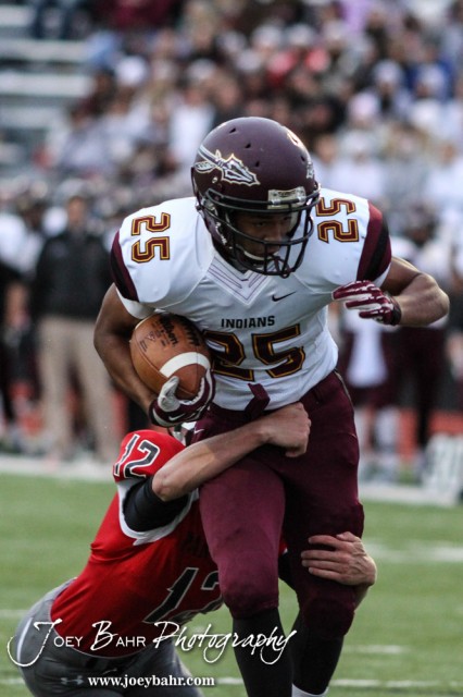 Great Bend Panther Nick Gerdes (#12) tries to tackle Hays Indian Isaiah Blackmon (#25) during the Hays Indians versus Great Bend Panthers High School Football game with Hays winning 49 to 6 at Memorial Stadium in Great Bend, Kansas on September 12, 2014. (Photo: Joey Bahr, www.joeybahr.com)