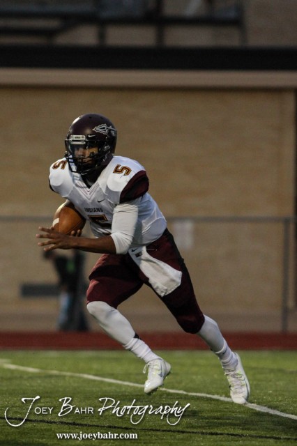 Hays Indian Alex Delton (#5) rushes with the ball during the Hays Indians versus Great Bend Panthers High School Football game with Hays winning 49 to 6 at Memorial Stadium in Great Bend, Kansas on September 12, 2014. (Photo: Joey Bahr, www.joeybahr.com)