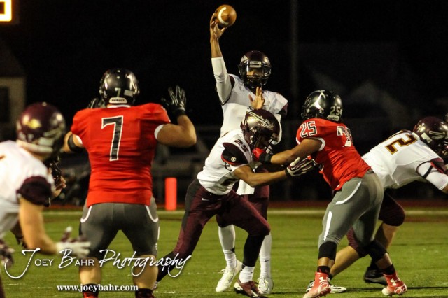 Hays Indian Alex Delton (#5) throws a pass during the Hays Indians versus Great Bend Panthers High School Football game with Hays winning 49 to 6 at Memorial Stadium in Great Bend, Kansas on September 12, 2014. (Photo: Joey Bahr, www.joeybahr.com)