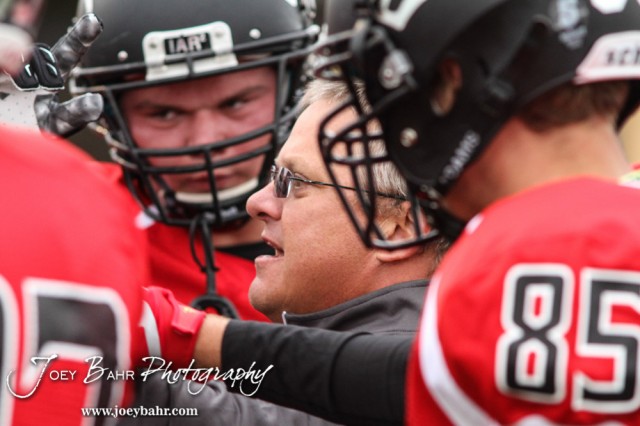 Great Bend Panther Assistant Coach Kelly Brack huddles up his group of players for warmups during the Hays Indians versus Great Bend Panthers High School Football game with Hays winning 49 to 6 at Memorial Stadium in Great Bend, Kansas on September 12, 2014. (Photo: Joey Bahr, www.joeybahr.com)
