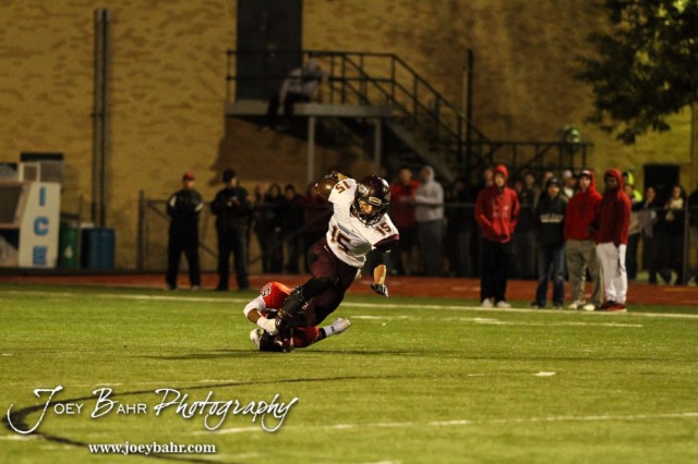 Great Bend Panther Jose Batres (#19) tackles Hays Indian Maddux Winter (#15) during the Hays Indians versus Great Bend Panthers High School Football game with Hays winning 49 to 6 at Memorial Stadium in Great Bend, Kansas on September 12, 2014. (Photo: Joey Bahr, www.joeybahr.com)