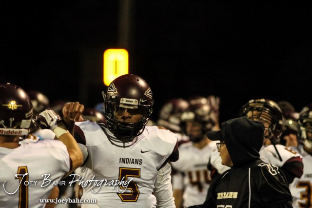Hays Indian Alex Delton (#5) celebrates a touchdown with his teammate, Adam Klaus (#1) during the Hays Indians versus Great Bend Panthers High School Football game with Hays winning 49 to 6 at Memorial Stadium in Great Bend, Kansas on September 12, 2014. (Photo: Joey Bahr, www.joeybahr.com)