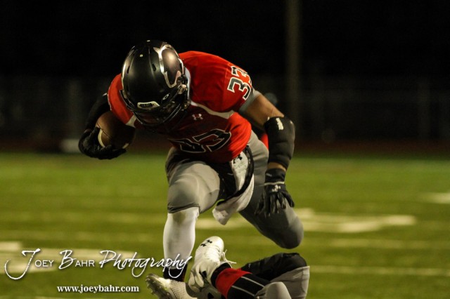 Great Bend Panther Adrian Falk (#33) hurdles over a player during the Hays Indians versus Great Bend Panthers High School Football game with Hays winning 49 to 6 at Memorial Stadium in Great Bend, Kansas on September 12, 2014. (Photo: Joey Bahr, www.joeybahr.com)