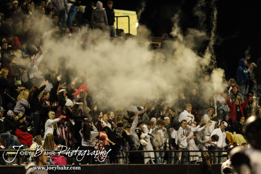 The Hays High Student Section throws up chalk dust to celebrate scoring a touchdown during the Hays Indians versus Great Bend Panthers High School Football game with Hays winning 49 to 6 at Memorial Stadium in Great Bend, Kansas on September 12, 2014. (Photo: Joey Bahr, www.joeybahr.com)