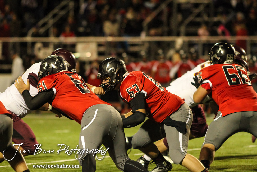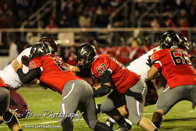 Great Bend Panthers Jackson Randall (#61) and Trey Popp (#63) launch to block a Hays Indian during the Hays Indians versus Great Bend Panthers High School Football game with Hays winning 49 to 6 at Memorial Stadium in Great Bend, Kansas on September 12, 2014. (Photo: Joey Bahr, www.joeybahr.com)