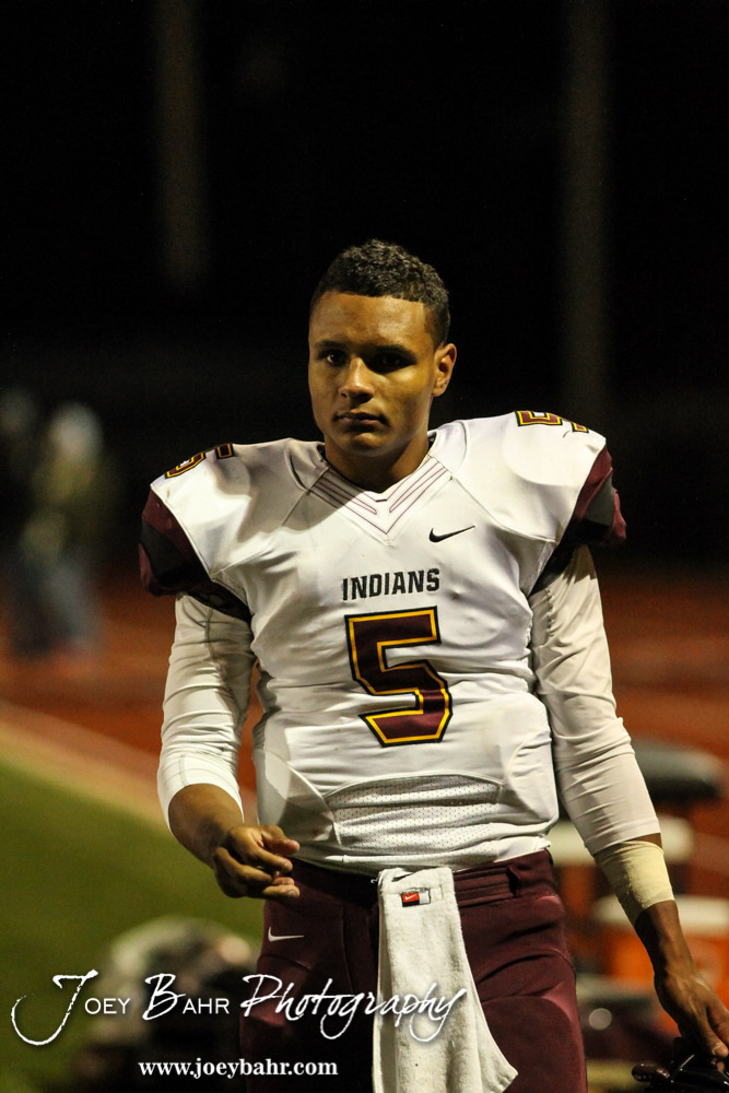 Hays Indian Alex Delton (#5) walks on the sideline during the Hays Indians versus Great Bend Panthers High School Football game with Hays winning 49 to 6 at Memorial Stadium in Great Bend, Kansas on September 12, 2014. (Photo: Joey Bahr, www.joeybahr.com)