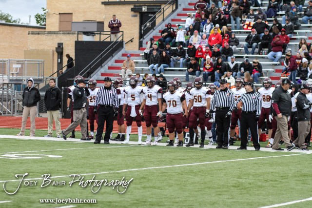 The Hays Indian Captains wait to go out for the coin toss during the Hays Indians versus Great Bend Panthers High School Football game with Hays winning 49 to 6 at Memorial Stadium in Great Bend, Kansas on September 12, 2014. (Photo: Joey Bahr, www.joeybahr.com)