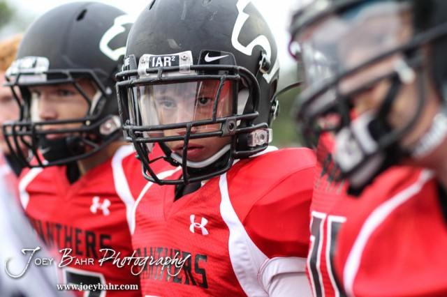 Great Bend Panther Quinton Elliott (#5) waits for the Referee to toss the coin before the Hays Indians versus Great Bend Panthers High School Football game with Hays winning 49 to 6 at Memorial Stadium in Great Bend, Kansas on September 12, 2014. (Photo: Joey Bahr, www.joeybahr.com)