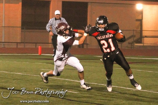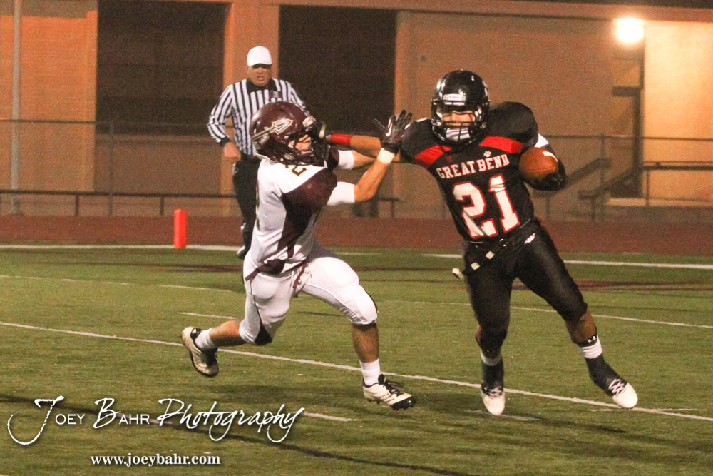 Great Bend Panther Jonathan Allende (#21) stiff arms Hays Indian Seth Junk (#22 ) during the Hays at Great Bend Football Game with a final score of 31 to 13 Hays at Memorial Stadium in Great Bend, Kansas on October 12, 2012. (Photo: Joey Bahr, www.joeybahr.com)