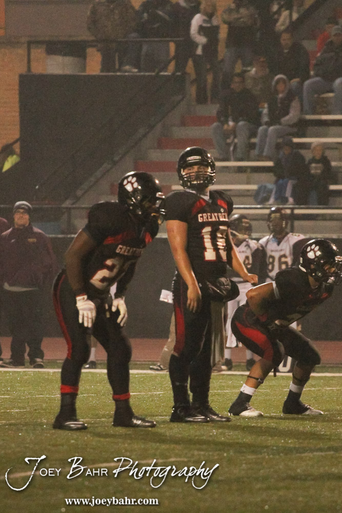 Great Bend Panther Quarterback Matt Marshall (#18) looks to the sideline for a play during the Hays at Great Bend Football Game with a final score of 31 to 13 Hays at Memorial Stadium in Great Bend, Kansas on October 12, 2012. (Photo: Joey Bahr, www.joeybahr.com)