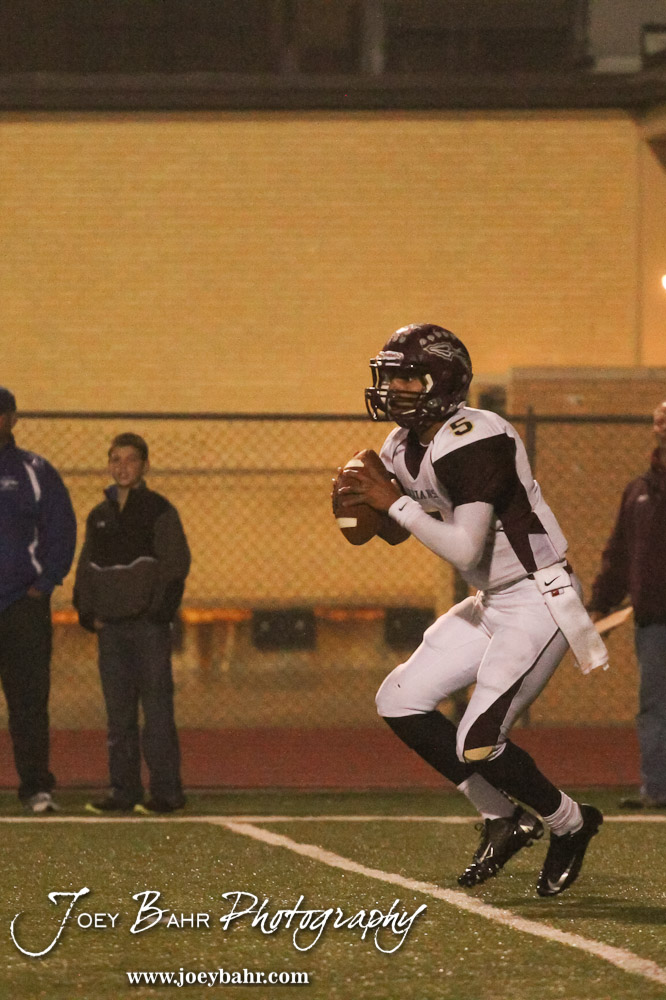 Hays Indian Quarterback Alex Delton (#5 ) looks to pass the ball during the Hays at Great Bend Football Game with a final score of 31 to 13 Hays at Memorial Stadium in Great Bend, Kansas on October 12, 2012. (Photo: Joey Bahr, www.joeybahr.com)