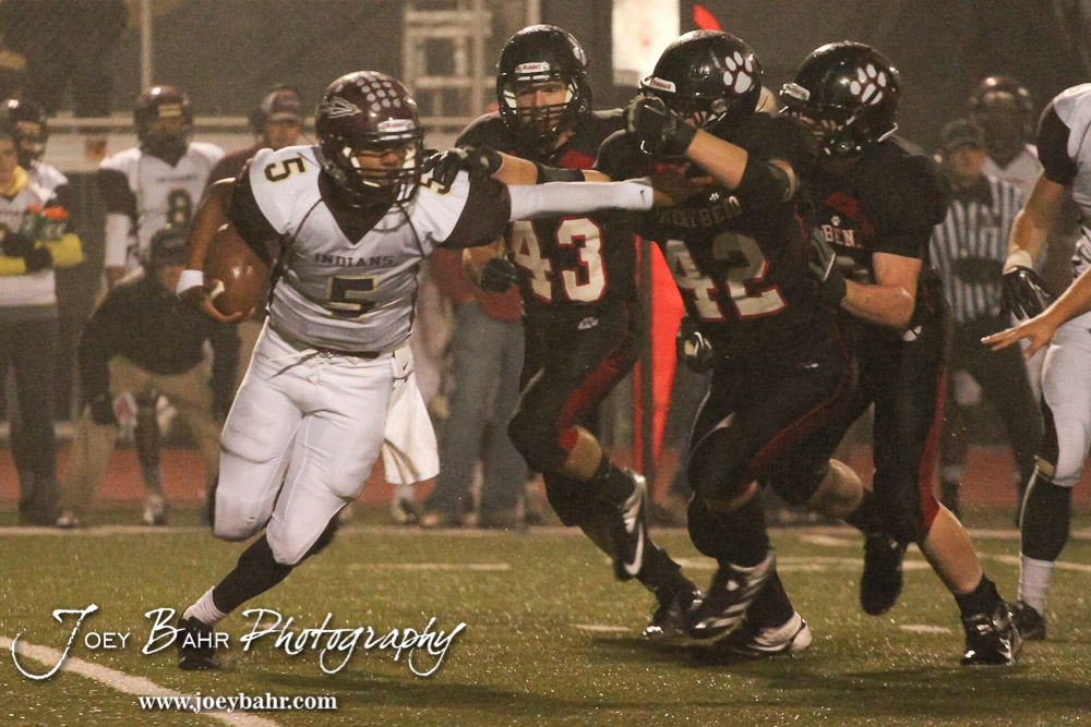 Hays Indian Alex Delton (#5 ) tires to hold off the tackle of Great Bend Panther Chad Touslee (#42) during the Hays at Great Bend Football Game with a final score of 31 to 13 Hays at Memorial Stadium in Great Bend, Kansas on October 12, 2012. (Photo: Joey Bahr, www.joeybahr.com)