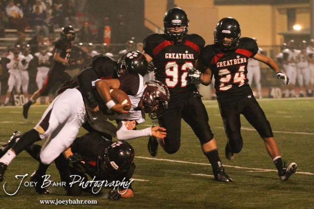 Great Bend Panther Ryan Zecha (#51) tackles Hays Indian Alex Delton (#5 ) during the Hays at Great Bend Football Game with a final score of 31 to 13 Hays at Memorial Stadium in Great Bend, Kansas on October 12, 2012. (Photo: Joey Bahr, www.joeybahr.com)