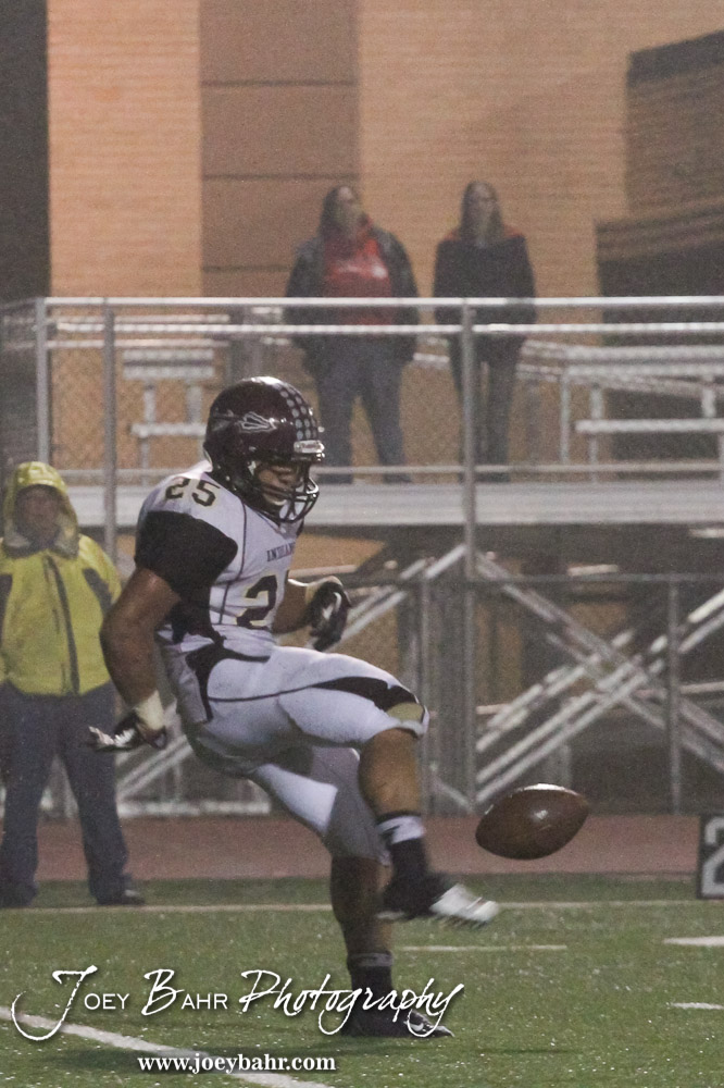 Hays Indian David Cardinal (#25 ) punts the ball during the Hays at Great Bend Football Game with a final score of 31 to 13 Hays at Memorial Stadium in Great Bend, Kansas on October 12, 2012. (Photo: Joey Bahr, www.joeybahr.com)