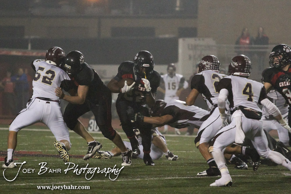 Great Bend Panther Joshua Lopez (#22) runs through a tackle during the Hays at Great Bend Football Game with a final score of 31 to 13 Hays at Memorial Stadium in Great Bend, Kansas on October 12, 2012. (Photo: Joey Bahr, www.joeybahr.com)