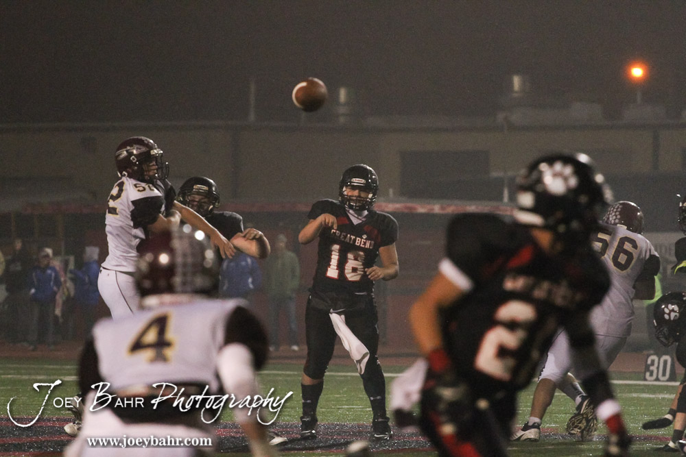 Great Bend Panther Matt Marshall (#18) passes the ball during the Hays at Great Bend Football Game with a final score of 31 to 13 Hays at Memorial Stadium in Great Bend, Kansas on October 12, 2012. (Photo: Joey Bahr, www.joeybahr.com)