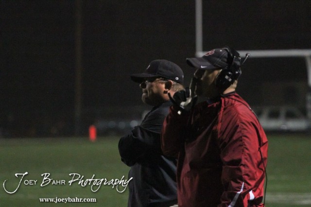 Two Great Bend Panther coaches watch a play develop during the Hays at Great Bend Football Game with a final score of 31 to 13 Hays at Memorial Stadium in Great Bend, Kansas on October 12, 2012. (Photo: Joey Bahr, www.joeybahr.com)