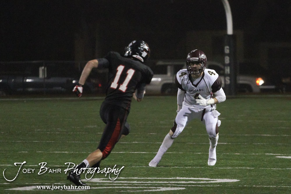 Hays Indian Chance Pitcock (#4 ) watches Great Bend Panther Receiver Brock Ibarra (#11) during the Hays at Great Bend Football Game with a final score of 31 to 13 Hays at Memorial Stadium in Great Bend, Kansas on October 12, 2012. (Photo: Joey Bahr, www.joeybahr.com)