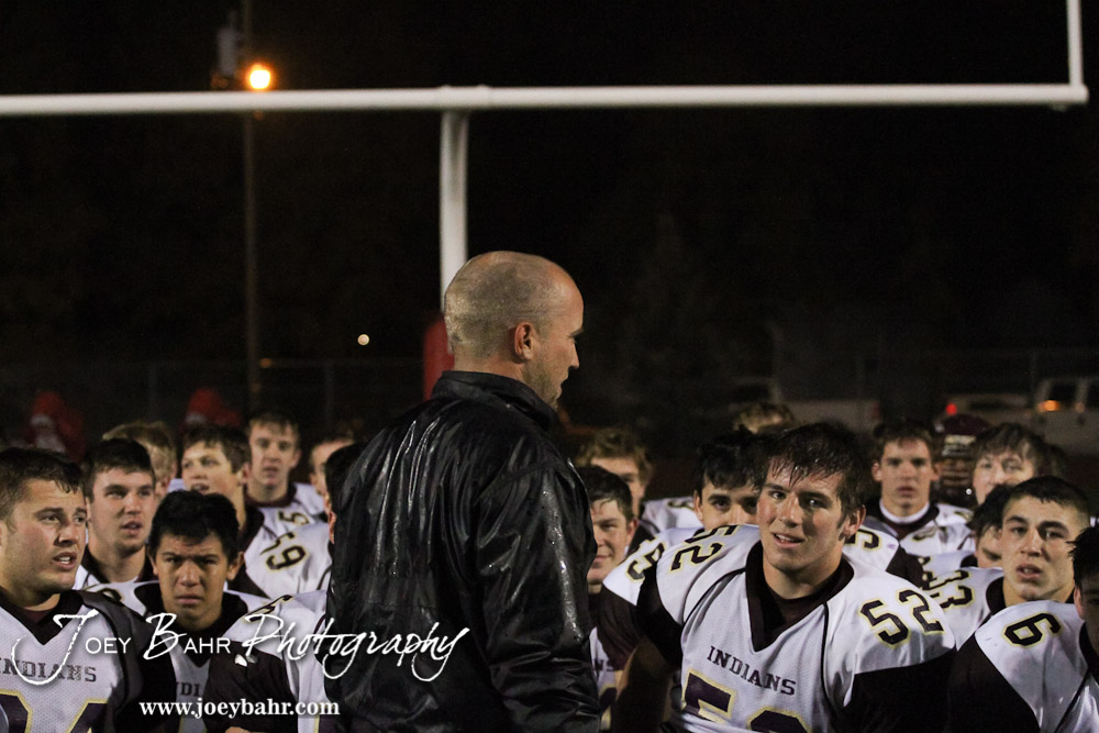 Hays Indian Head Coach Ryan Cornelson addresses his team following the Hays at Great Bend Football Game with a final score of 31 to 13 Hays at Memorial Stadium in Great Bend, Kansas on October 12, 2012. (Photo: Joey Bahr, www.joeybahr.com)