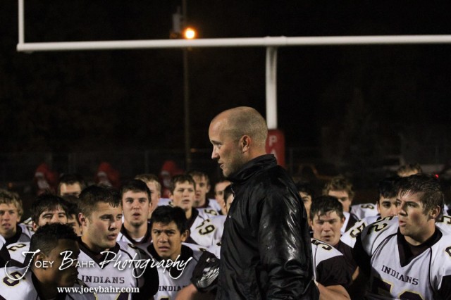 Hays Indian Head Coach Ryan Cornelson addresses his team following the Hays at Great Bend Football Game with a final score of 31 to 13 Hays at Memorial Stadium in Great Bend, Kansas on October 12, 2012. (Photo: Joey Bahr, www.joeybahr.com)