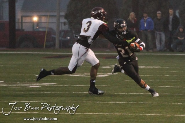 Hays Indian Emilio Mitchell (#3 ) tries to tackle Great Bend Panther Jonathan Allende (#21) during the Hays at Great Bend Football Game with a final score of 31 to 13 Hays at Memorial Stadium in Great Bend, Kansas on October 12, 2012. (Photo: Joey Bahr, www.joeybahr.com)