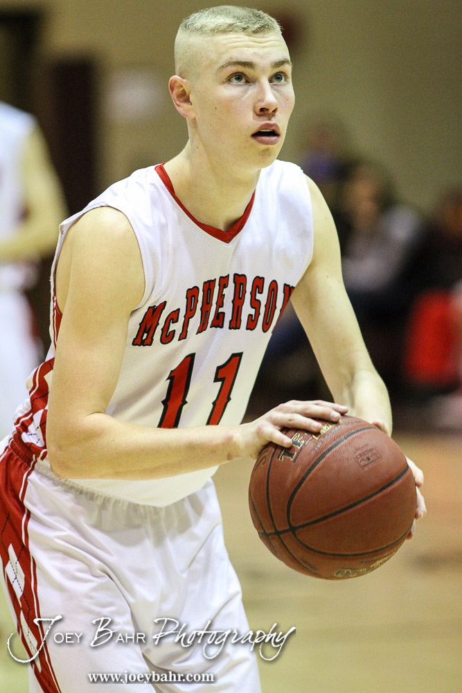 McPherson Bullpup Drew Pyle (#11) shoots a free throw during the 4A Division I Sub-State First Round Game with the McPherson Bullpups and Ulysses Tigers with McPherson winning 84 to 40 at Hays High School in Hays, Kansas on March 5, 2015. (Photo: Joey Bahr, www.joeybahr.com)
