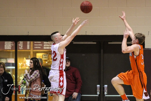McPherson Bullpup Kyler Kinnamon (#22) shoots a three point shot during the 4A Division I Sub-State First Round Game with the McPherson Bullpups and Ulysses Tigers with McPherson winning 84 to 40 at Hays High School in Hays, Kansas on March 5, 2015. (Photo: Joey Bahr, www.joeybahr.com)