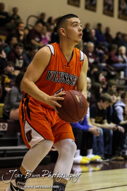 Ulysses Tiger Luis Heredia (#4) looks to take a shot during the 4A Division I Sub-State First Round Game with the McPherson Bullpups and Ulysses Tigers with McPherson winning 84 to 40 at Hays High School in Hays, Kansas on March 5, 2015. (Photo: Joey Bahr, www.joeybahr.com)