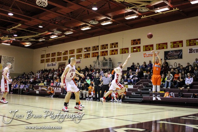 Ulysses Tiger Luis Heredia (#4) shoots a three point shot during the 4A Division I Sub-State First Round Game with the McPherson Bullpups and Ulysses Tigers with McPherson winning 84 to 40 at Hays High School in Hays, Kansas on March 5, 2015. (Photo: Joey Bahr, www.joeybahr.com)
