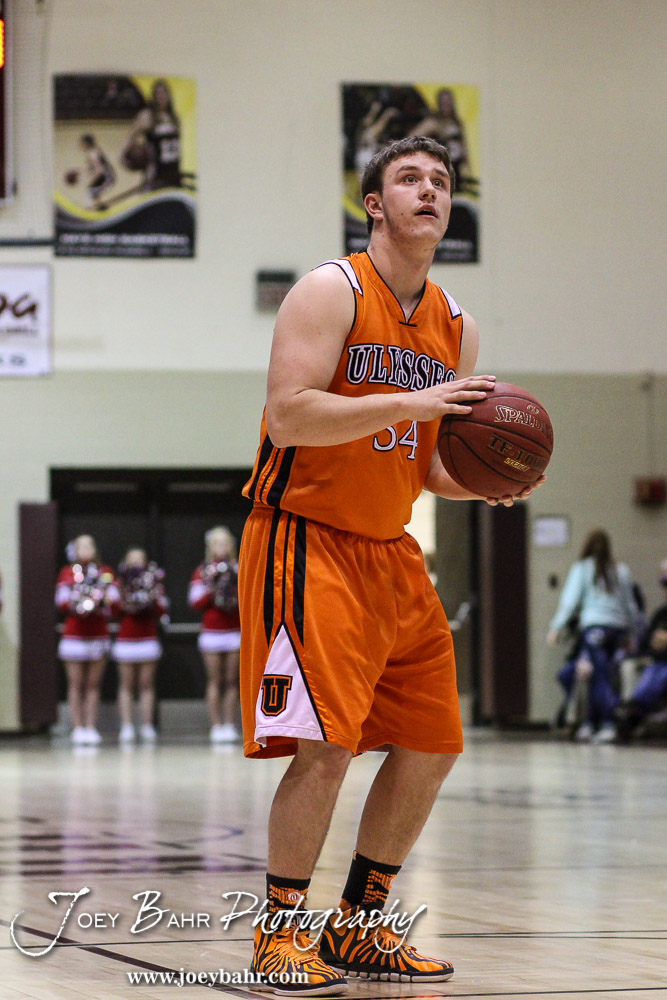 Ulysses Tiger Sheldon Bankes (#34) shoots a free throw during the 4A Division I Sub-State First Round Game with the McPherson Bullpups and Ulysses Tigers with McPherson winning 84 to 40 at Hays High School in Hays, Kansas on March 5, 2015. (Photo: Joey Bahr, www.joeybahr.com)