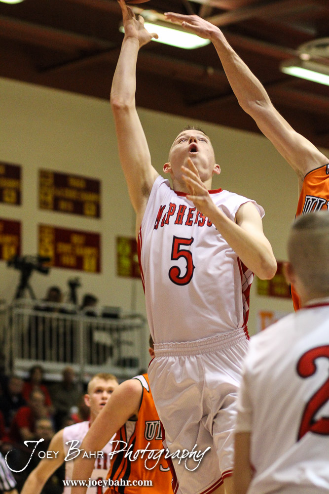 McPherson Bullpup Jacob Loecker (#5) goes up for a layup during the 4A Division I Sub-State First Round Game with the McPherson Bullpups and Ulysses Tigers with McPherson winning 84 to 40 at Hays High School in Hays, Kansas on March 5, 2015. (Photo: Joey Bahr, www.joeybahr.com)