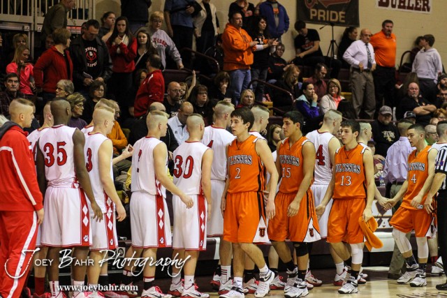 Members of the McPherson Bullpups and Ulysses Tigers shake hands following the 4A Division I Sub-State First Round Game with the McPherson Bullpups and Ulysses Tigers with McPherson winning 84 to 40 at Hays High School in Hays, Kansas on March 5, 2015. (Photo: Joey Bahr, www.joeybahr.com)