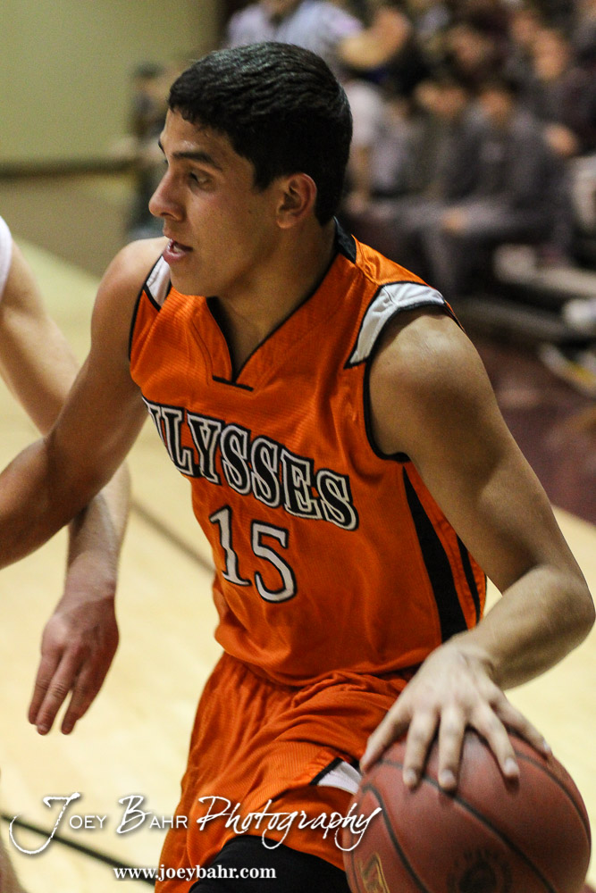 Ulysses Tiger Abraham Romero (#15) dribbles on the baseline during the 4A Division I Sub-State First Round Game with the McPherson Bullpups and Ulysses Tigers with McPherson winning 84 to 40 at Hays High School in Hays, Kansas on March 5, 2015. (Photo: Joey Bahr, www.joeybahr.com)