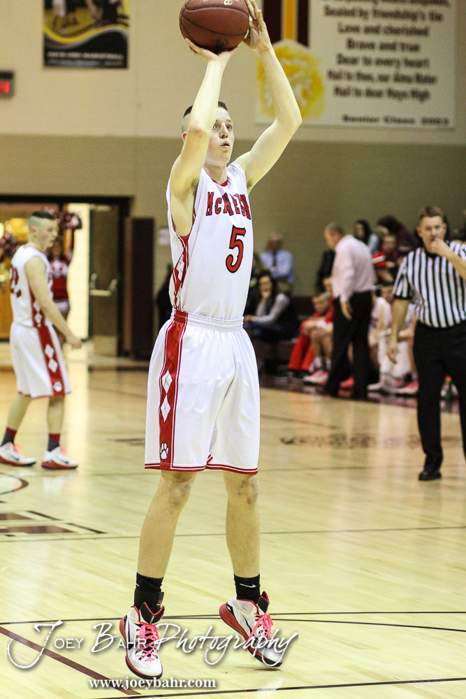 McPherson Bullpup Jacob Loecker (#5) shoots a free throw during the 4A Division I Sub-State First Round Game with the McPherson Bullpups and Ulysses Tigers with McPherson winning 84 to 40 at Hays High School in Hays, Kansas on March 5, 2015. (Photo: Joey Bahr, www.joeybahr.com)