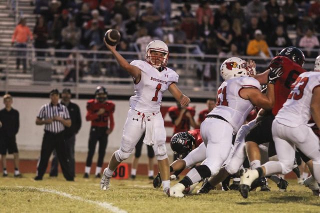 Hoisington Cardinal Tyler Specht (#1) throws a pass. The Hoisington Cardinals defeated the Ellsworth Bearcats 39 to 20 at Shanelac Field in Ellsworth, Kansas on October 14, 2016. (Photo: Joey Bahr, www.joeybahr.com)undefined