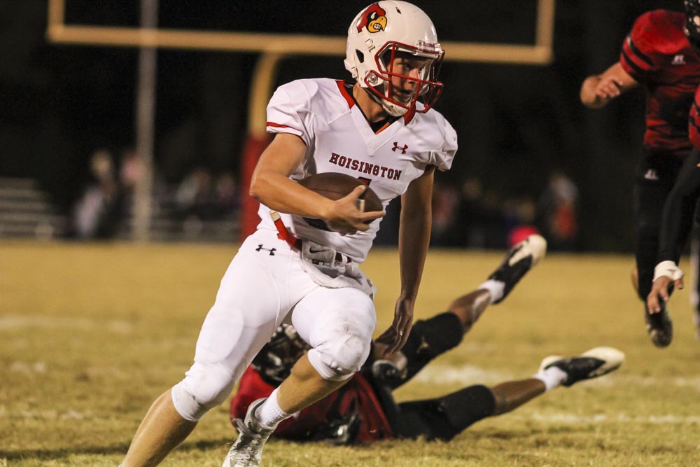 Hoisington Cardinal Tyler Specht (#1) rushes with the ball. The Hoisington Cardinals defeated the Ellsworth Bearcats 39 to 20 at Shanelac Field in Ellsworth, Kansas on October 14, 2016. (Photo: Joey Bahr, www.joeybahr.com)undefined
