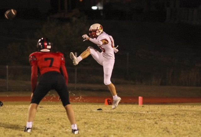 Hoisington Cardinal Brenner Donovan (#80) kicks off the ball after a touchdown. The Hoisington Cardinals defeated the Ellsworth Bearcats 39 to 20 at Shanelac Field in Ellsworth, Kansas on October 14, 2016. (Photo: Joey Bahr, www.joeybahr.com)undefined