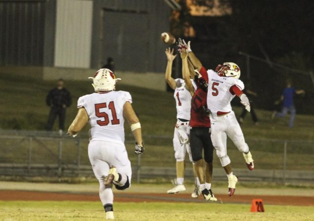 Hoisington Cardinal Cameron Davis (#5) breaks up a pass meant for Ellsworth Bearcat Jordan Base (#5). The Hoisington Cardinals defeated the Ellsworth Bearcats 39 to 20 at Shanelac Field in Ellsworth, Kansas on October 14, 2016. (Photo: Joey Bahr, www.joeybahr.com)undefined