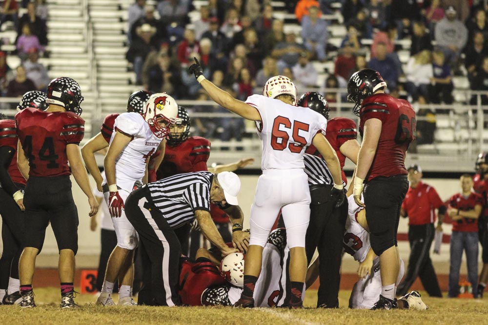 Hoisington Cardinal Ben Schneider (#65) signals that his team recovered the ball, the Refs pulled that the ball remain with Ellsworth. The Hoisington Cardinals defeated the Ellsworth Bearcats 39 to 20 at Shanelac Field in Ellsworth, Kansas on October 14, 2016. (Photo: Joey Bahr, www.joeybahr.com)undefined